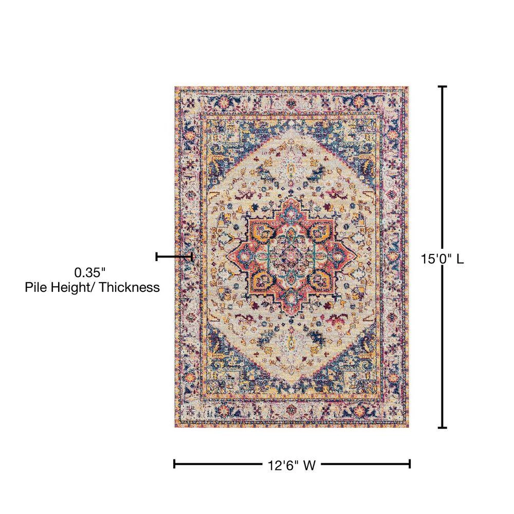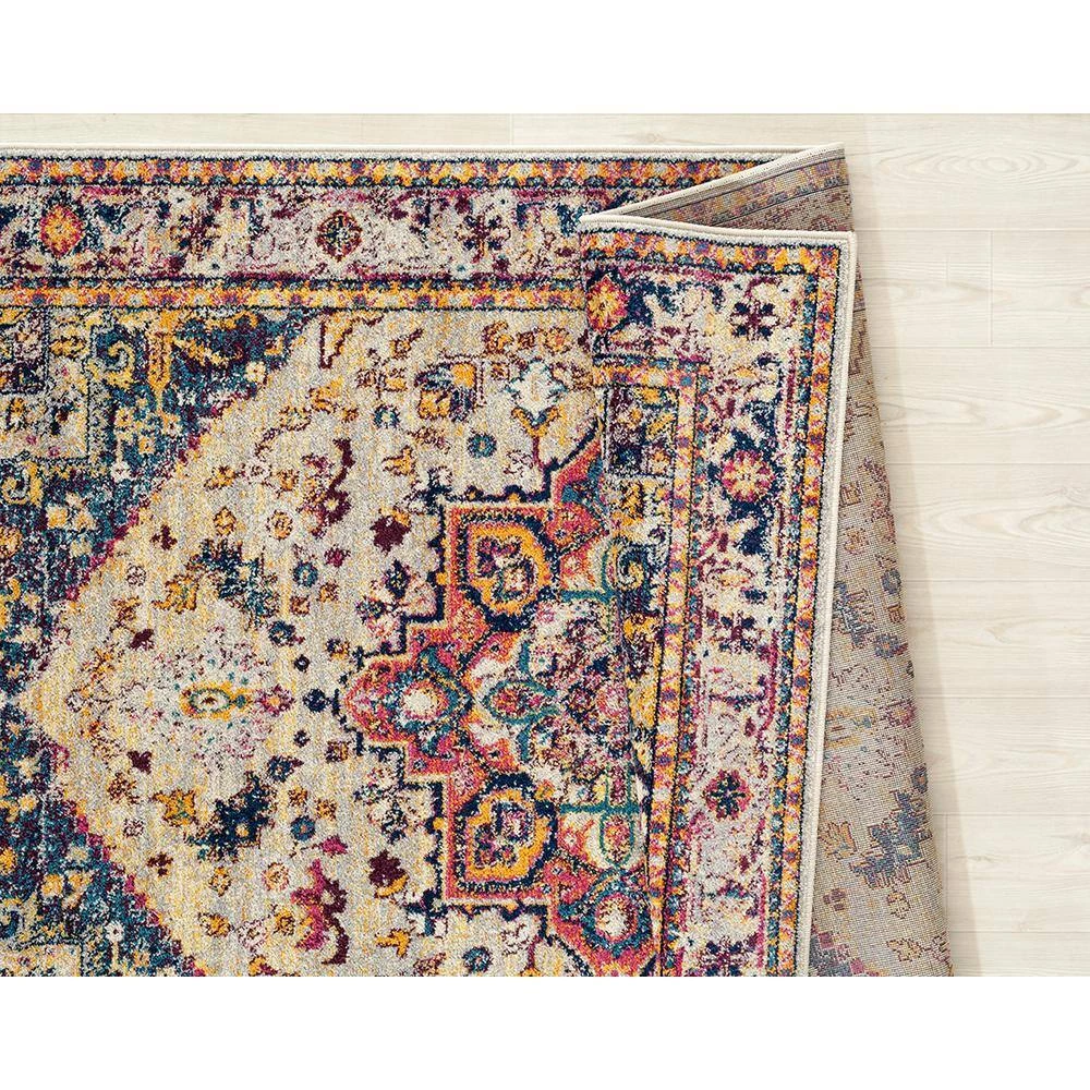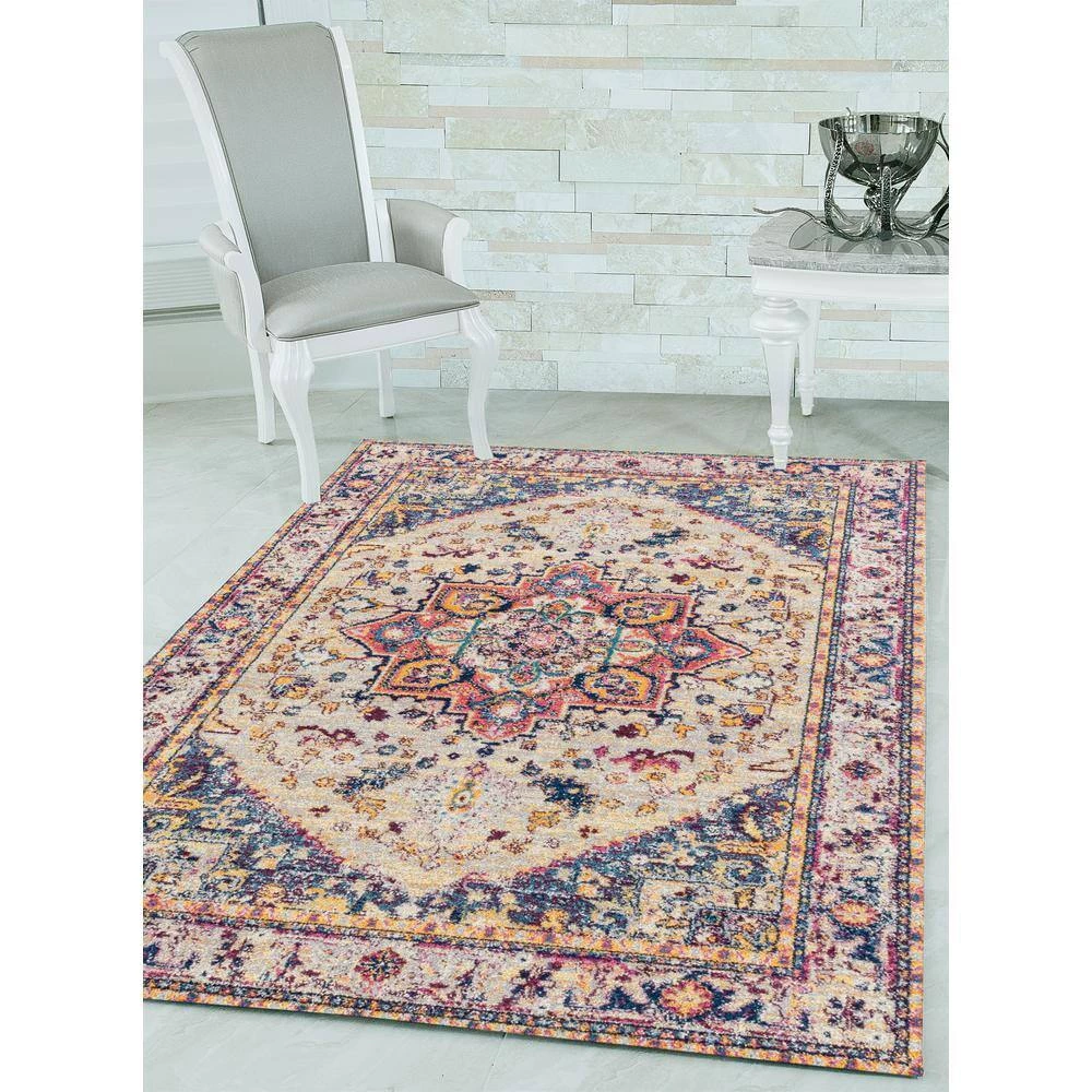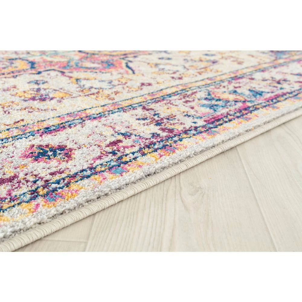 Add a vibrant and fun touch into any room with this spunky rug. Elaborated edging with a spacious medallion in the middle will truly create a focal point in your space. Featuring dazzling colors of cream, sky blue and magenta pink, this swank area rug will most definitely liven up your decor. Along with a designer look and feel, this exquisite rug is meant for durability with a cotton backing and is stain-resistant for your lifestyle needs.
