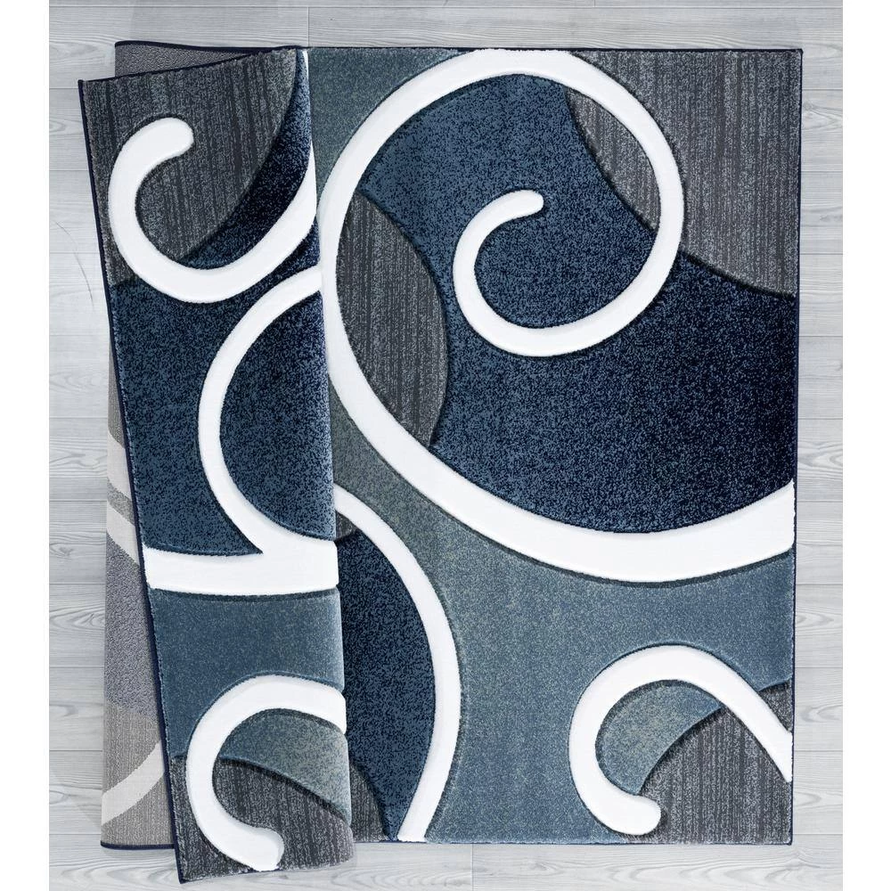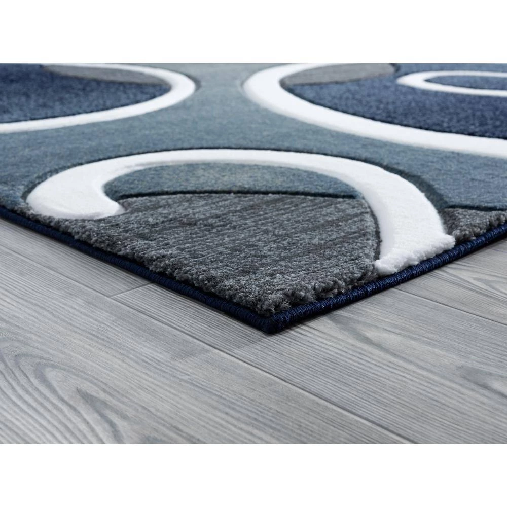 This whimsical rug will make a strong visual impact in your living space with its swirly design and contrasting colors. This stunning design is complimented with a navy blue background that contrasts the pure white swirls and accents of grey tones. This Machine-Made rug has a hand carved design and is stain and fade resistant for your lifestyle needs.