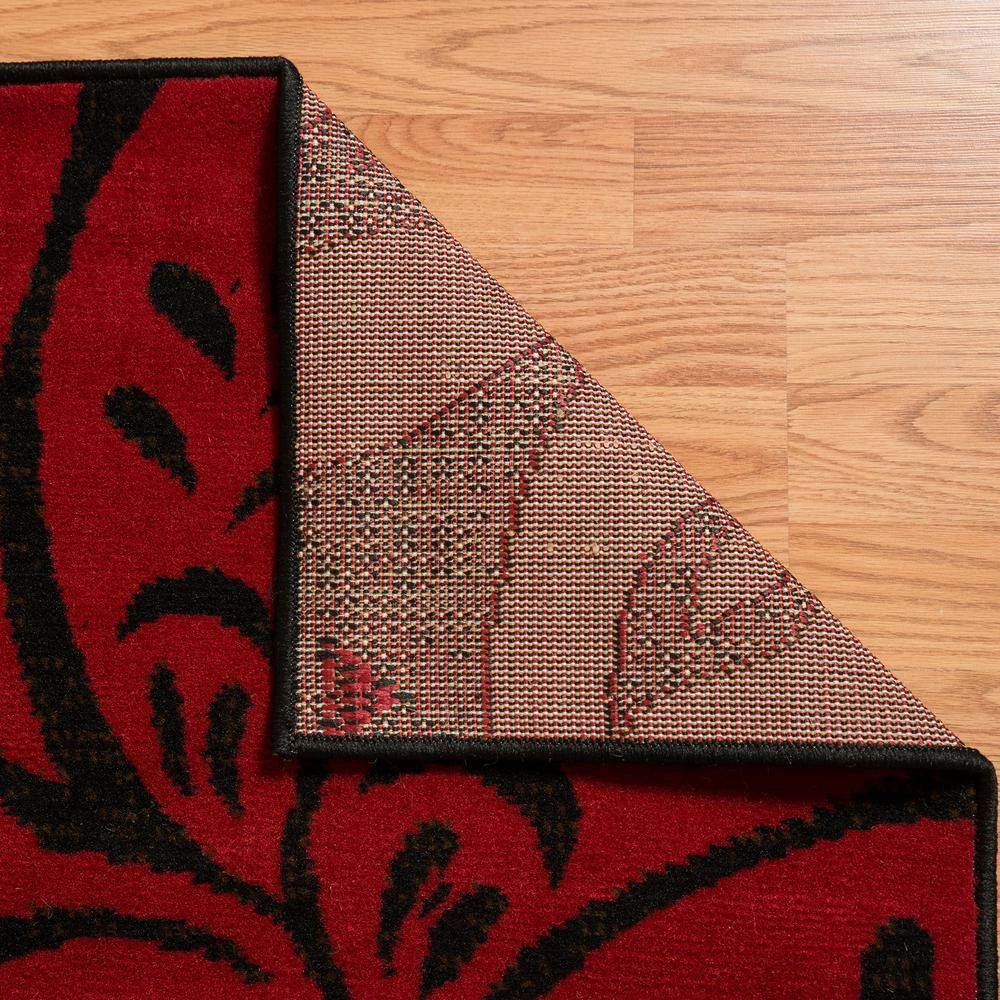 This contemporary rug design is inspired from enchanted botanical gardens. This marvelous rug will be the centerpiece of your room decor with its large flowers and hues of scarlet red and midnight black. Exquisite polypropylene machine-made rug with jute backing for long-lasting color and durability.